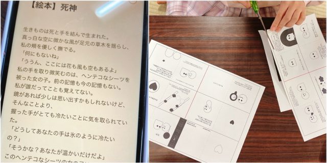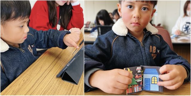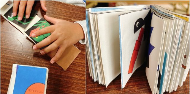 午後は岩田校区市民館へ。「(つくりたいお話の)台本を書いてきた」とやってきたのは、ブラジル籍の小4さん。半年ぶりの参加です。長文「台本」を用意したスマホを手に、哲学的なモノクロ絵本を完成させました。作品のみならず口調やふるまいまでグッと大人びて、6歳の頃からこれまで歌って踊ってのフリースタイル、前回6月には「ギャル雑誌」をつくっていただけに、その急変ぶりに驚きました。