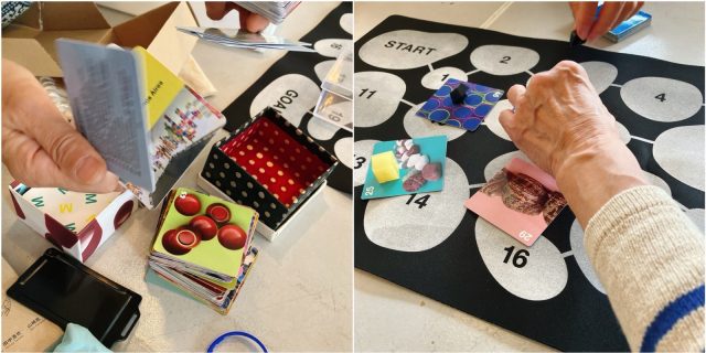おなはし絵カードでの自己紹介に始まり、まずは廃材カードゲームを体験。じっくりよく見る、色々な方向から多視点で見る。すると、違った見え方、思いがけない発見があり、それがクリエイティブの種になるのだとゲームを楽しむ中で気付きます。