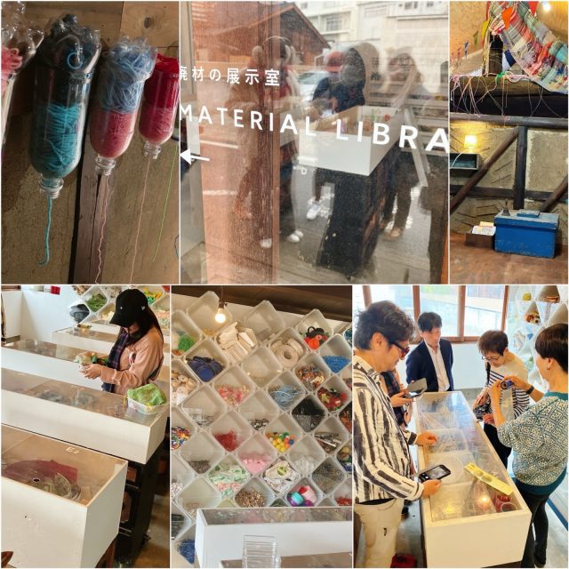 その柔らかくなった頭とよく見える眼と感じる手のまま、マテリアルライブラリへ皆で移動しました。ライブラリには、廃材を分解して素材や色で分類整理することで魅力的に生まれ変わった材料がいっぱい。使用後の転写フィルムの廃棄される側、グランドピアノを分解したパーツ、配電盤、糸巻、気になる材料のルーツも教えてもらいました。